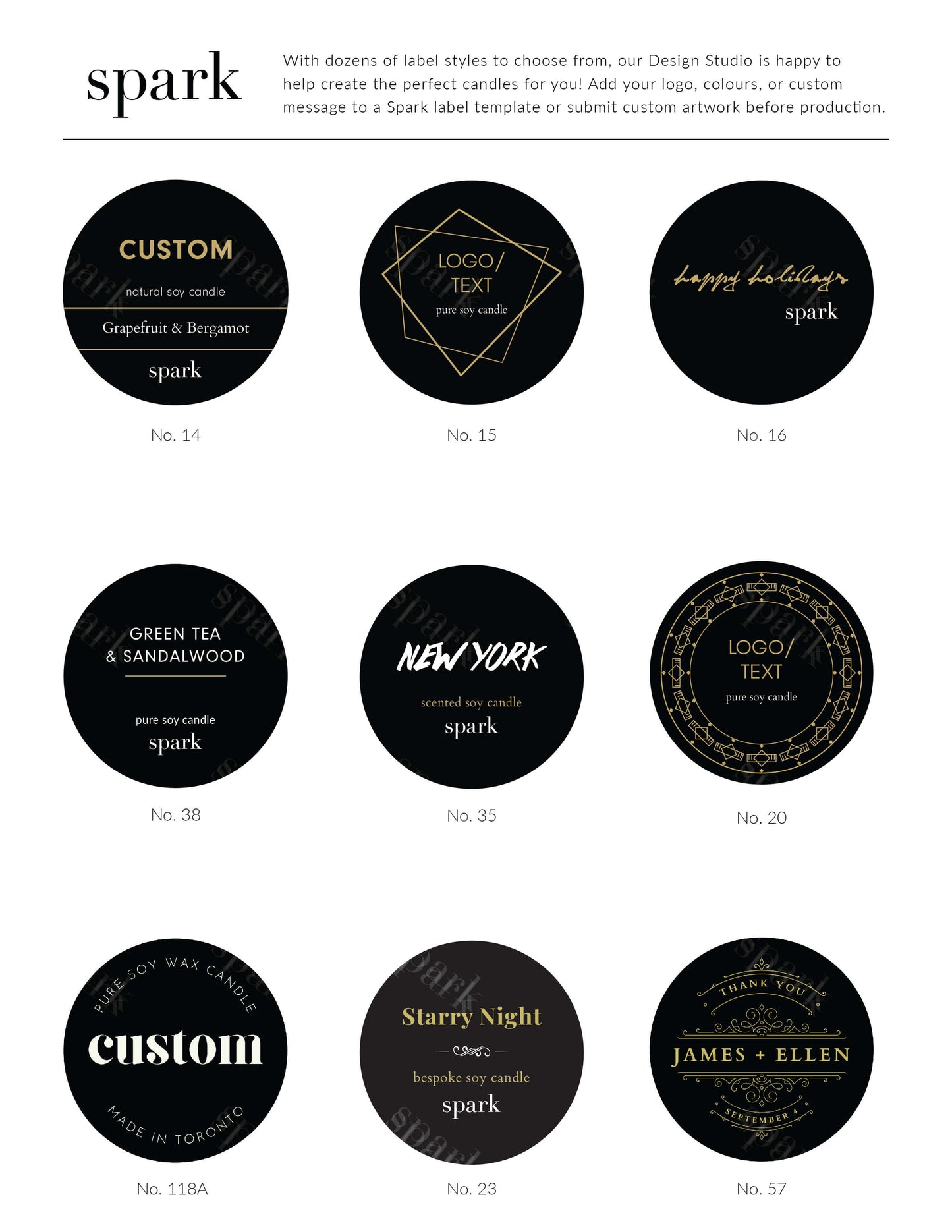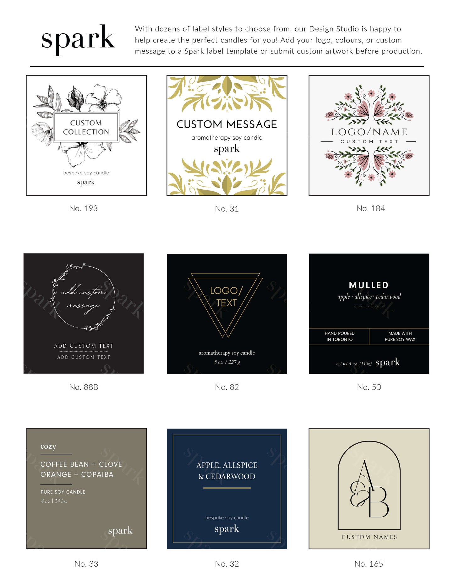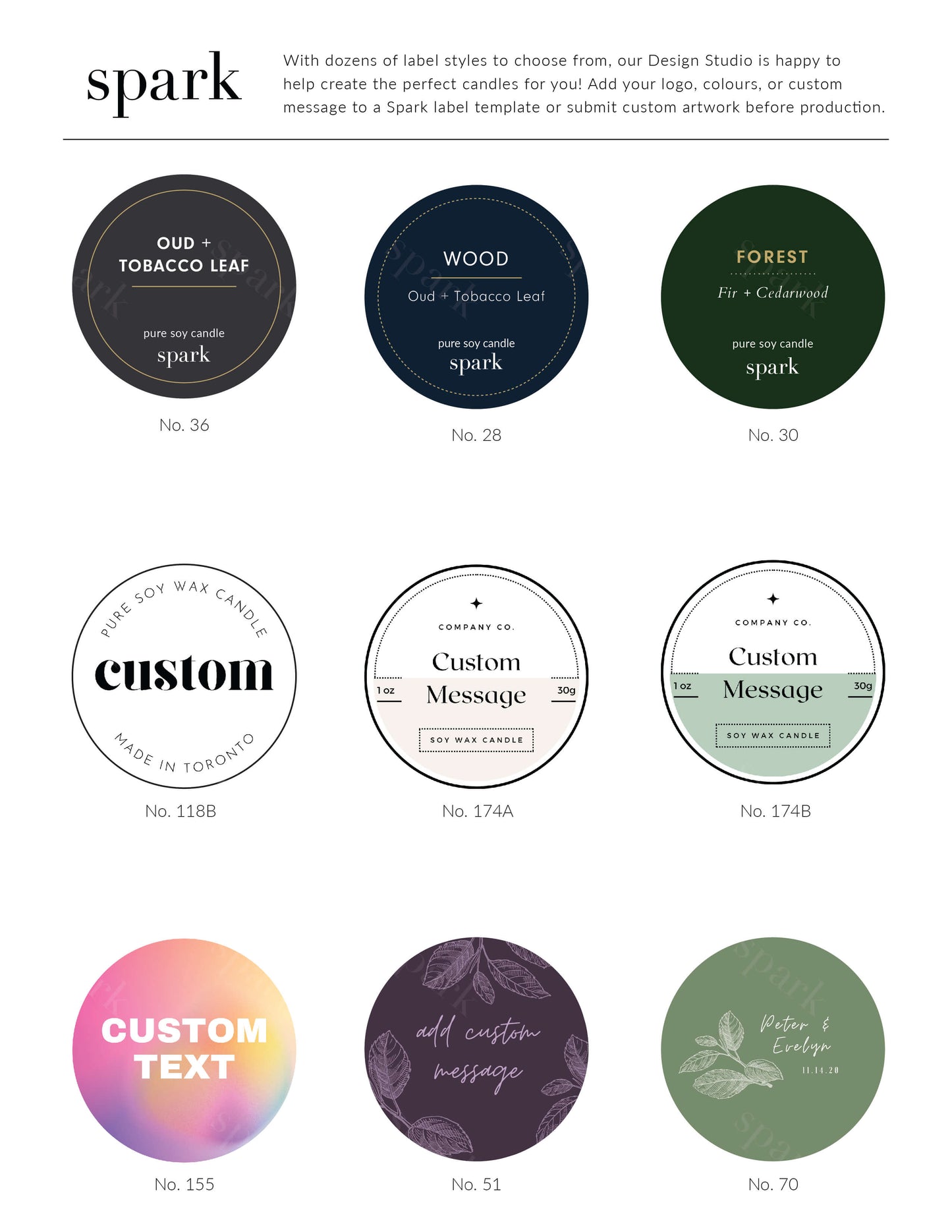 If you would like to order a branded sample candle, custom mockups start at $195 each and vary based on the product and level of customization. Please contact a Spark team member to process your custom sample request.