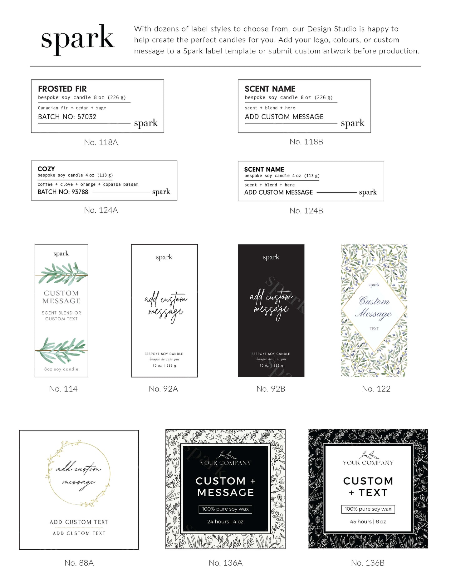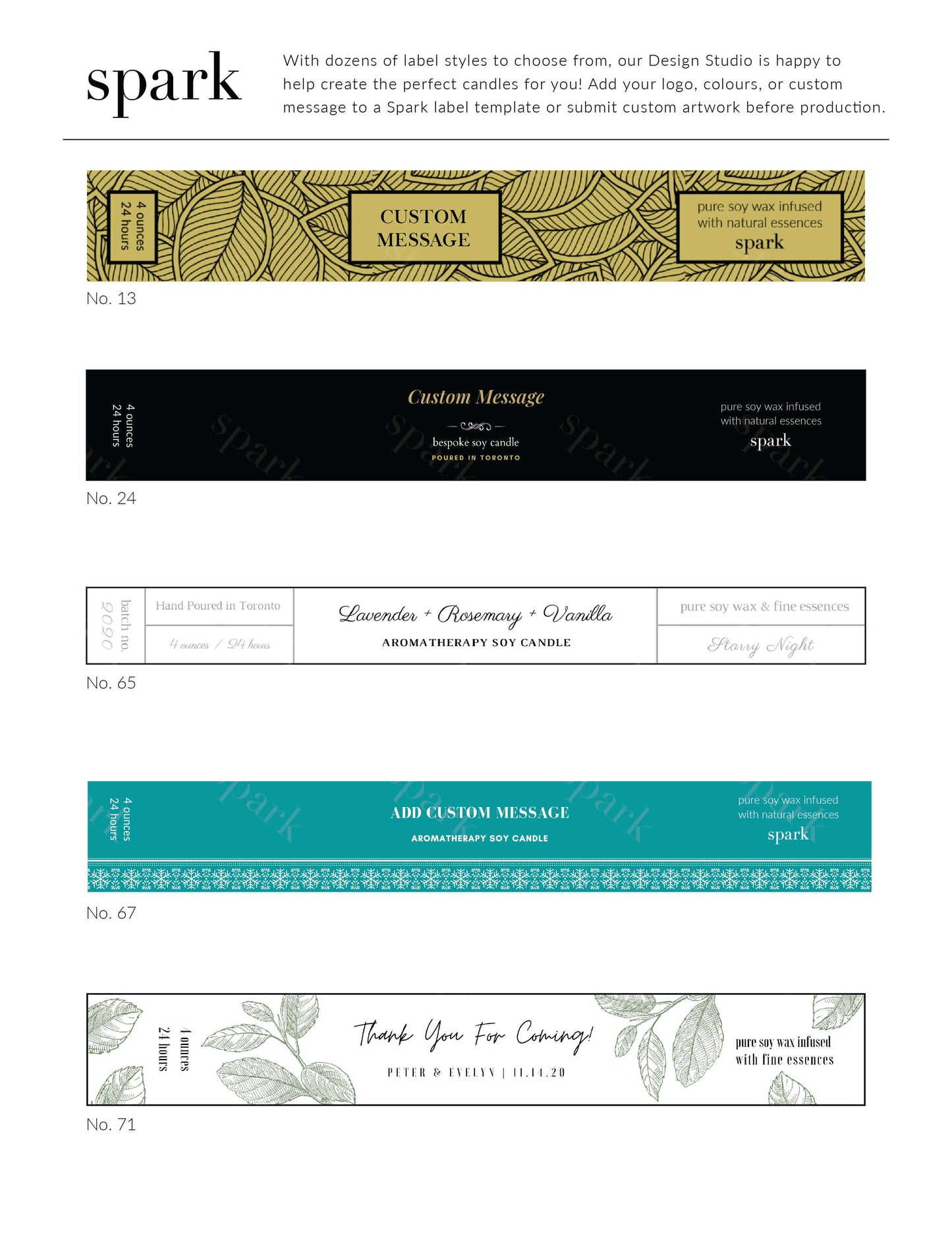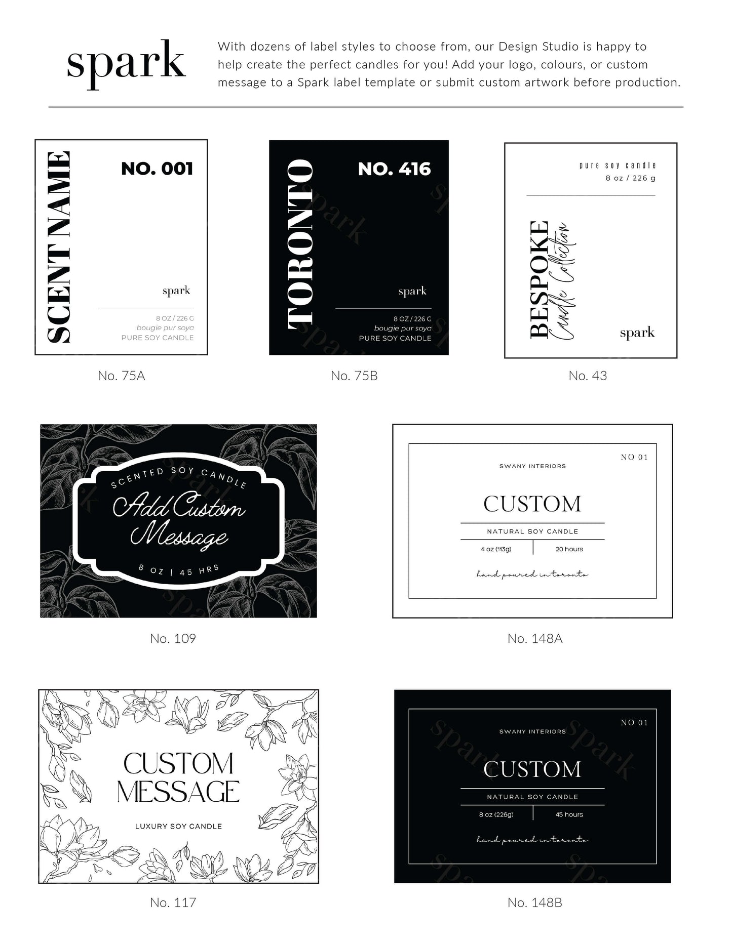 If you would like to order a branded sample candle, custom mockups start at $195 each and vary based on the product and level of customization. Please contact a Spark team member to process your custom sample request.