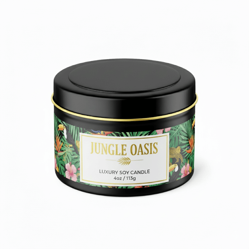 Our 4oz matte black tin candles with a customizable label pair a sleek black exterior with a gold interior and clean-burning, natural wax. Perfect for corporate branding, promos, and events—hand-poured by expert chandlers in the USA & Canada.