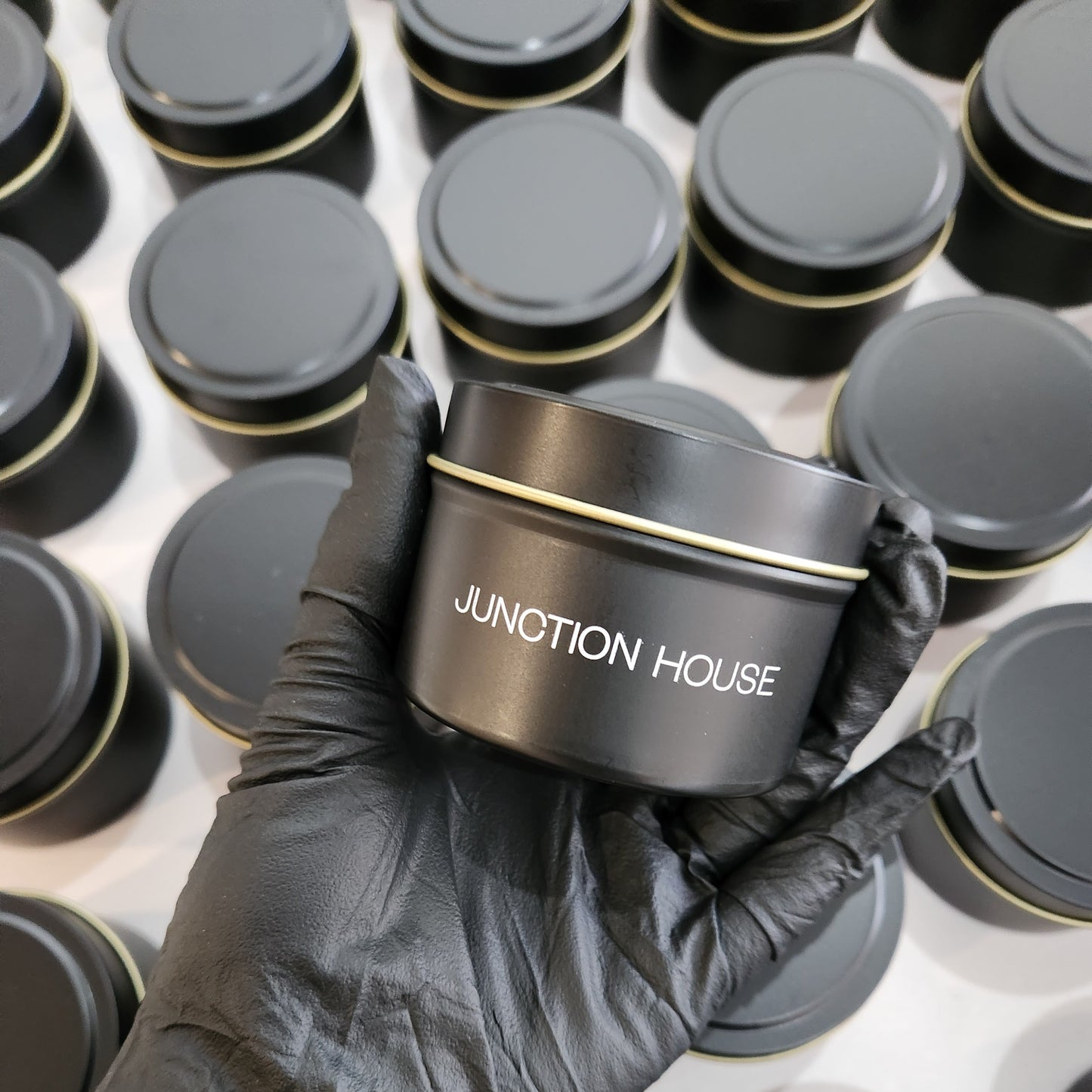 - Vessel: 4oz matte black tin with gold interior (2.6" W × 1.8" H)